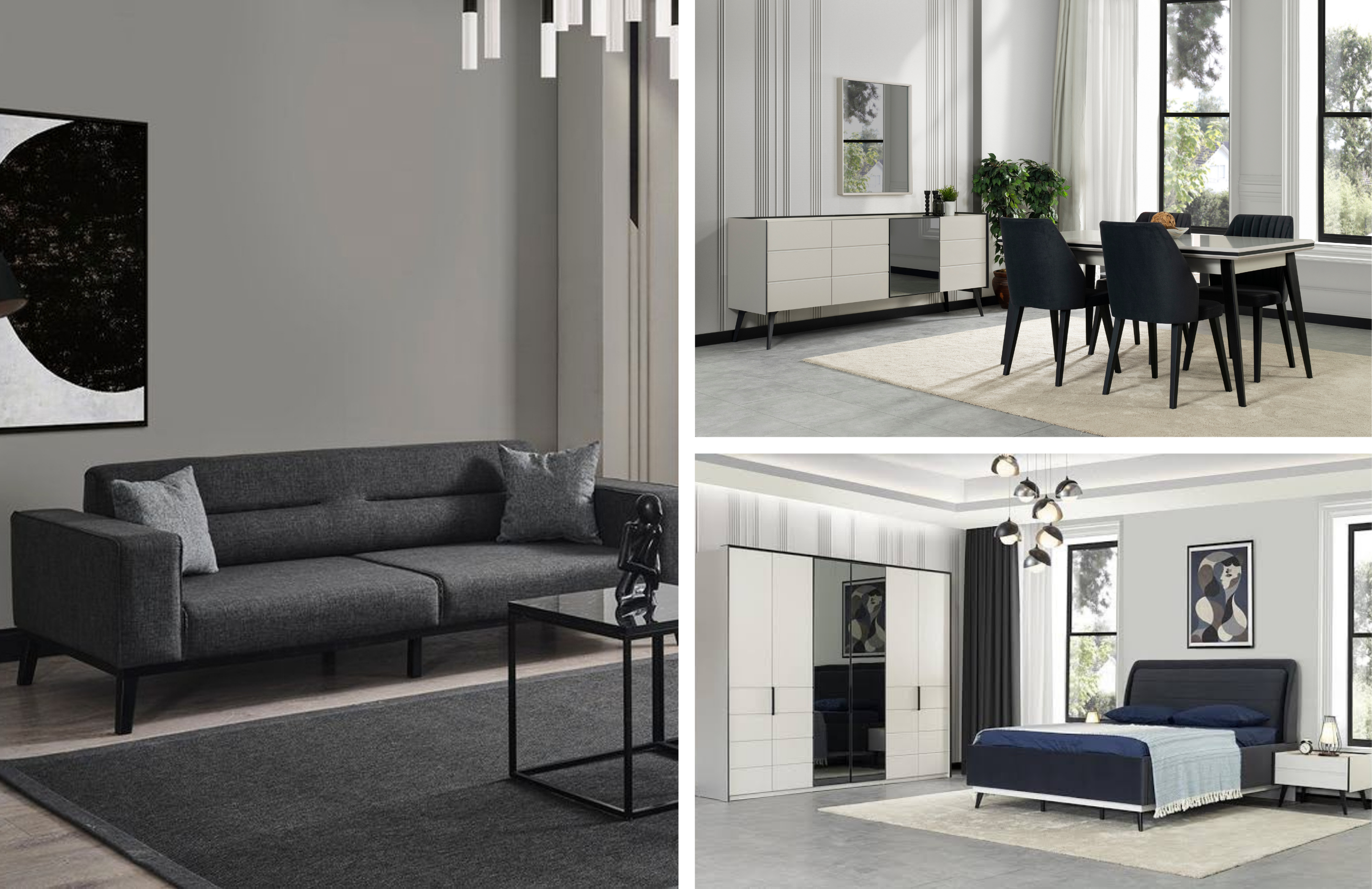 Paket İçeriği Paket 1.Sınıf Yonga Levha Malzemeden Üretilmiştir. Yatak Odası, Yemek Odası, Koltuk Takımı'ndan oluşmaktadır.